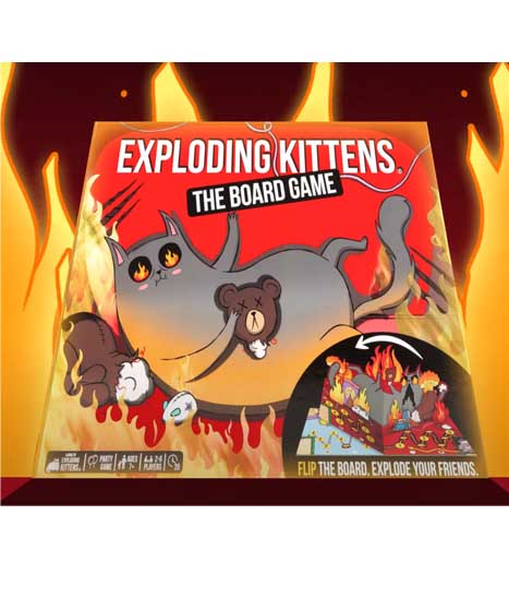 There's never been a board game like this before! Your goal is to make it to the end of the board without landing on the Exploding Kitten. To do that you'll play cards and plot strategies to sabotage your opponents. But don't get too cocky because one wrong move can cause the board to flip. This completely transforms the board to reveal a new path where every move could be your last. You have to think fast, form alliances, play smart, and avoid the Exploding Kittens at all costs.