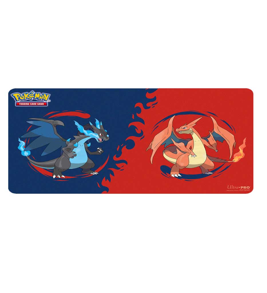 Officially licensed Playmat for the Pokemon Trading Card Game featuring vibrant, full-color artwork of Mega Charizard X and Mega Charizard Y